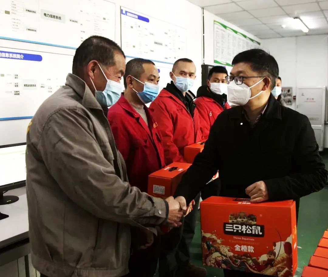在智能產(chǎn)業(yè)園動(dòng)力站,鄔江看望了長(zhǎng)期放棄節(jié)假日一直倒班工作的動(dòng)力站職工,對(duì)他們?yōu)楸U袭a(chǎn)業(yè)園區(qū)工廠的動(dòng)力而嚴(yán)謹(jǐn)工作表示感謝,并對(duì)他們致以新春的祝福和慰問。