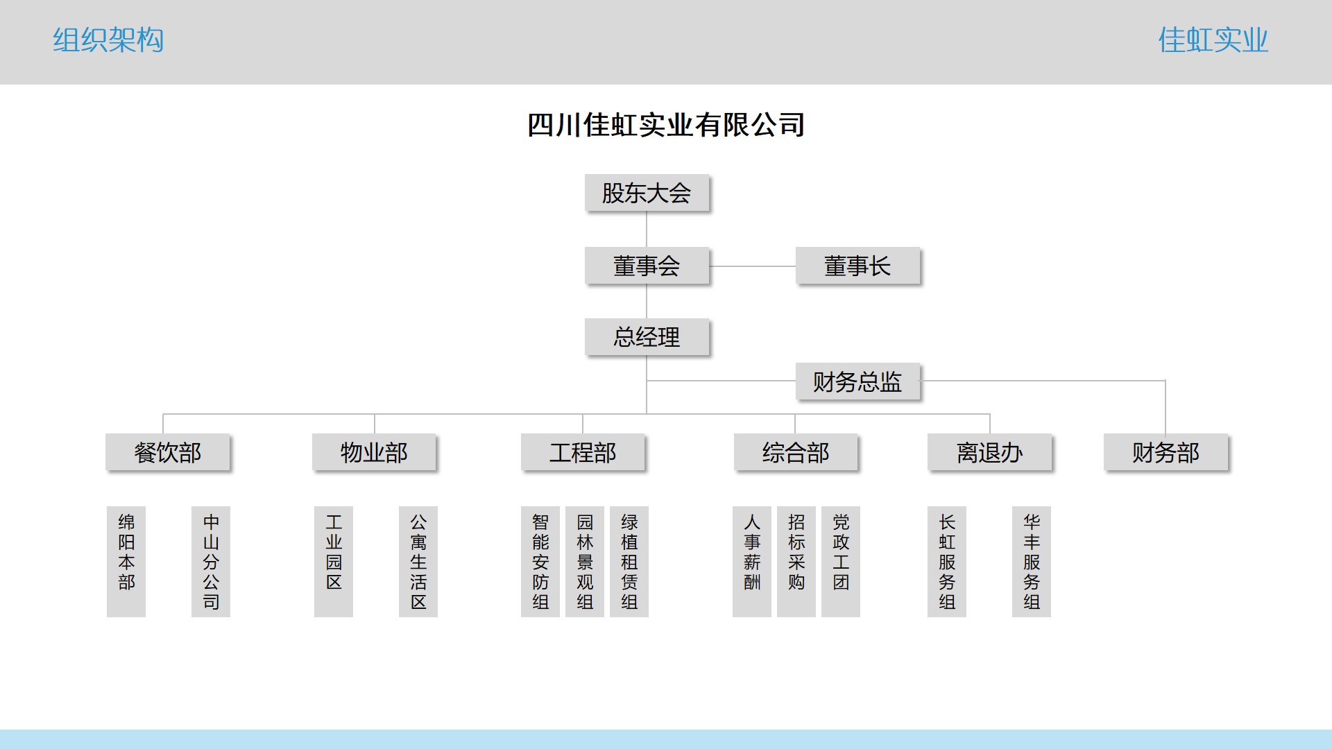 佳虹公司是一家集物業管理服務、團餐運營服務、電子與智能化設計與施工、園林景觀設計與施工、老年人服務等于一體的大型綜合服務企業,年收入近億元。公司擁有一支專業過硬、創先爭優、吃苦耐勞、善打硬仗的服務團隊,長期承接擔負長虹集團及旗下分子公司工業園區、辦公場所物業管理、員工餐飲等后勤保障服務,總服務面積數百萬平方米,服務對象數萬人。